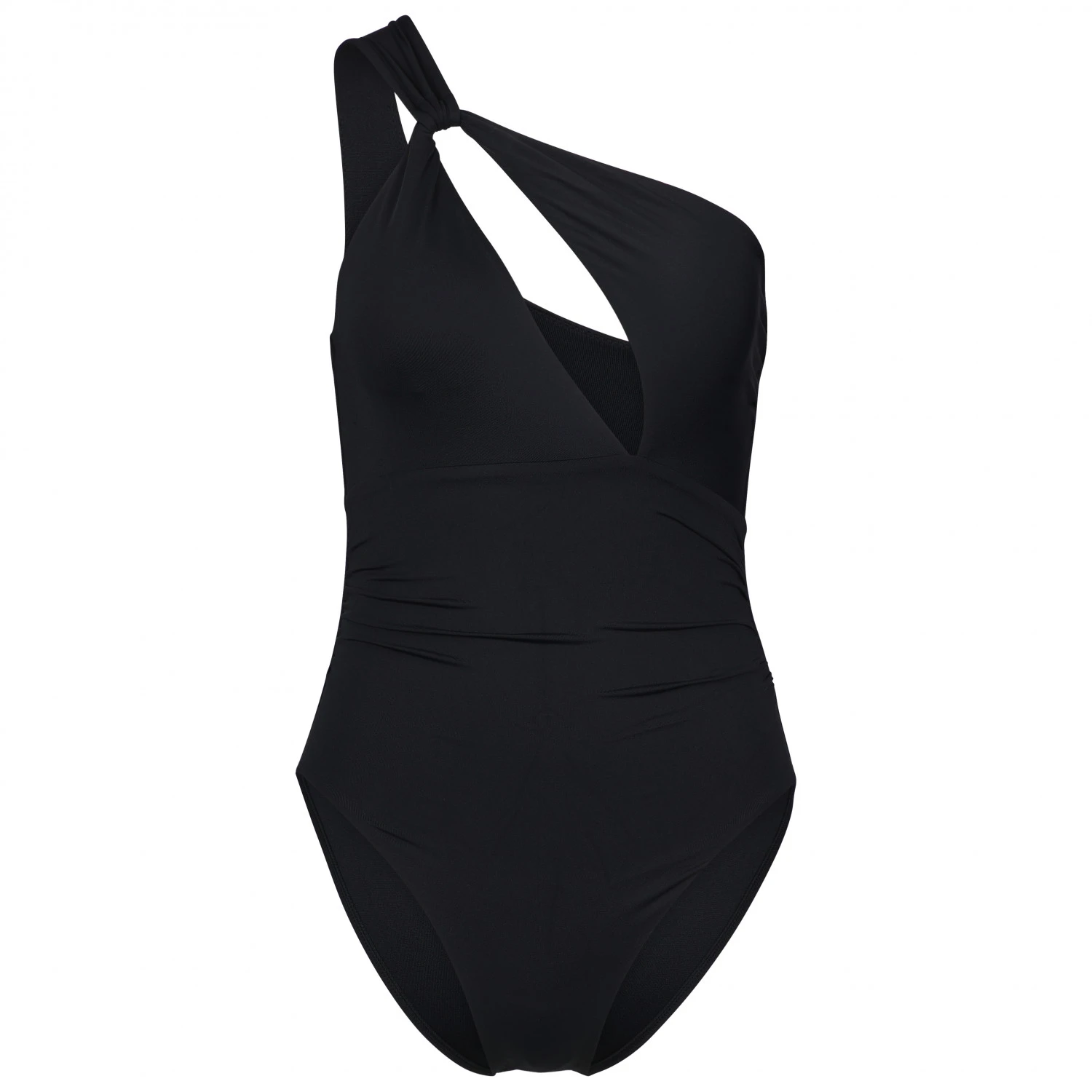 Der tief ausgeschnittene Badeanzug mit seinem einseitigen Träger zieht die Blicke. Raffungen an den Seiten machen zudem eine gute Figur. Das elastische Material passt sich individuell an Deinen Körper an. Der nächste Strandtag oder ein entspanntes Sonnenbad am Pool können starten.